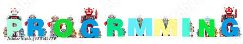 The watermark will not be included on Wall mural.: Retro tin robot toys hold up the word programming s