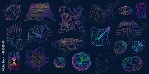 Wall mural retrofuturistic wireframe shapes, 3d sphere and distorted perspective grids. line mesh geometric obj