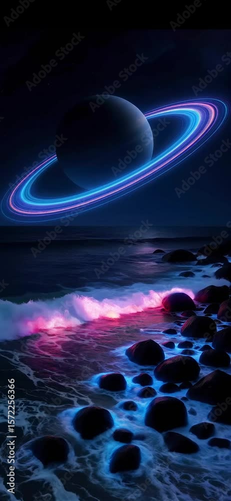 Wall mural : Ringed planet above the ocean- space background