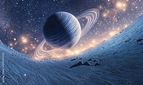 Wall mural ringed planet in space with glowing stars with ai generated. - Wall murals Wall mural ringed planet in space with glowing stars with ai generated. - Wall murals