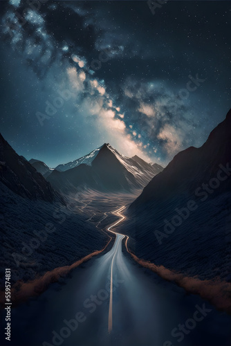 Wall mural : Road leading to distance in a mountain valley with a milky way galaxy, illustration digital generati