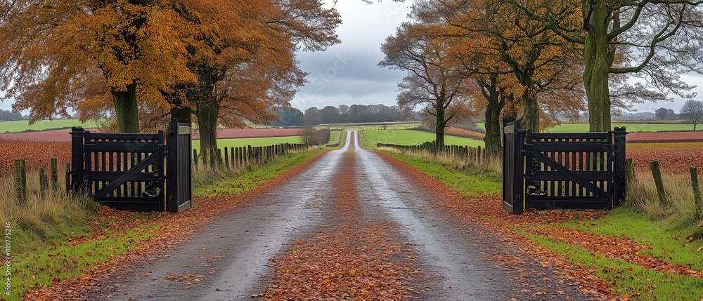 Road with a gate on the left and a gate on the right - the road is wet and there are trees in the bacWall mural