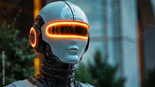 The watermark will not be included on Wall mural.: Robot activating a high-tech visor in a futuristic urban setting