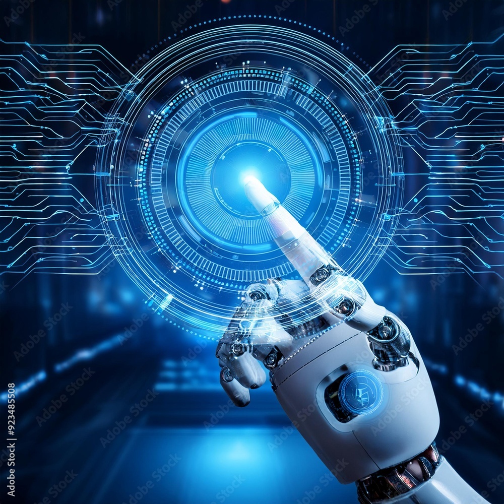 Wall mural robot hand interacting with futuristic interface. - Wall murals Wall mural robot hand interacting with futuristic interface. - Wall murals