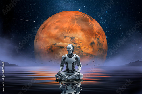 Wall mural : Robot meditating in front of the planet mars - ai generative