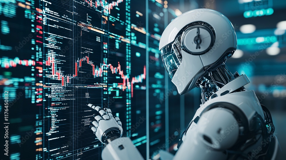 Wall mural robot sitting at a futuristic trading desk analyzing stock graphs on virtual screens, [ai analysis],