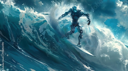 Wall mural robot surfer riding wave: a robot surfer maintaining balance and grace while riding a massive wave. - Wall murals Wall mural robot surfer riding wave: a robot surfer maintaining balance and grace while riding a massive wave. - Wall murals