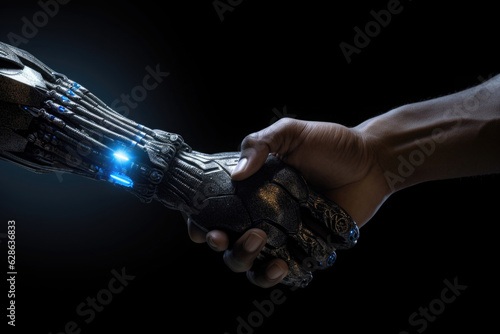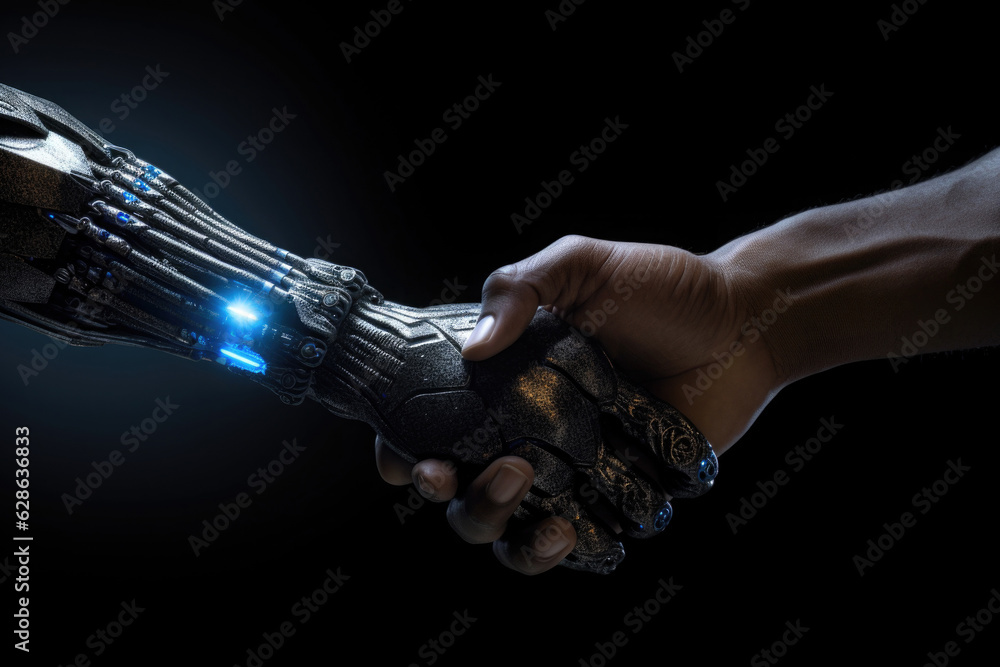 Wall mural robotic and human arms interact with each other. handshake between human and artificial intelligence - Wall murals Wall mural robotic and human arms interact with each other. handshake between human and artificial intelligence - Wall murals