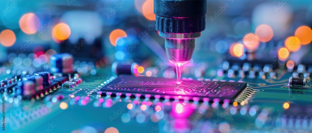 The watermark will not be included on Wall mural.: Robotic arm assembling components with precision laser