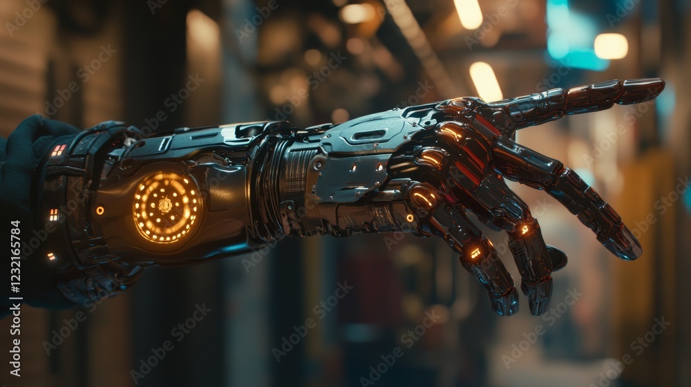 The watermark will not be included on Wall mural.: Robotic arm pointing with index finger in futuristic setting