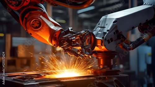 The watermark will not be included on Wall mural.: Robotic arm with high precision laser technology performing meticulously executed welding in an adva