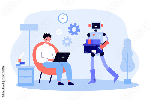 Wall mural robotic character carrying documents for man working at laptop. male character using mechanical assi