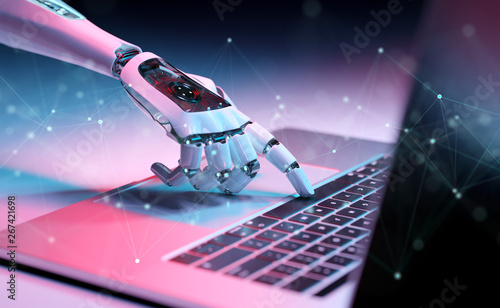 Wall mural : Robotic hand pressing a keyboard on a laptop 3d rendering