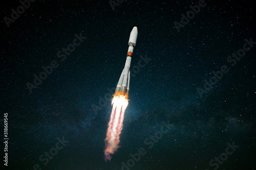 Wall mural : Rocket flies on the background of the starry sky, real spaceship in flight, launch rocket - flying ro