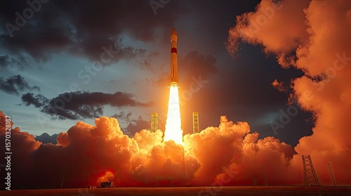 Rocket launch, film-like composition using low angles, lighting emphasizing the exhaust and surroundWall mural