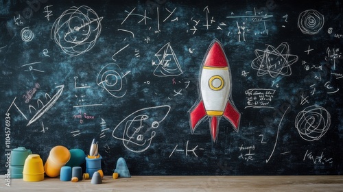 The watermark will not be included on Wall mural.: Rocket launch concept with chalkboard and colorful objects