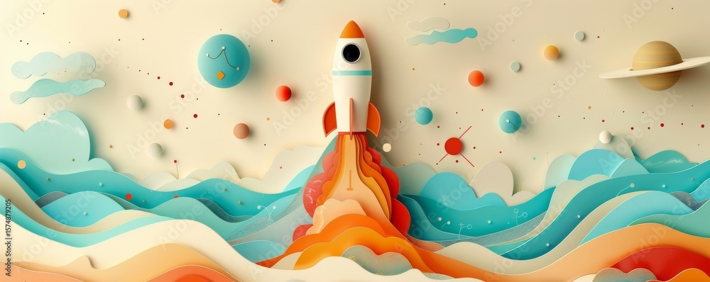 Wall mural rocket soaring through colorful abstract space landscape with planets and clouds