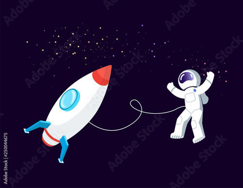 Wall mural rocket space vector, astronaut floating in cosmos with spaceship. person tied to shuttle with rope,