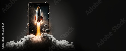 Wall mural rocket taking off from mobile phone screen on black background with copy space on the side, generati - Wall murals Wall mural rocket taking off from mobile phone screen on black background with copy space on the side, generati - Wall murals