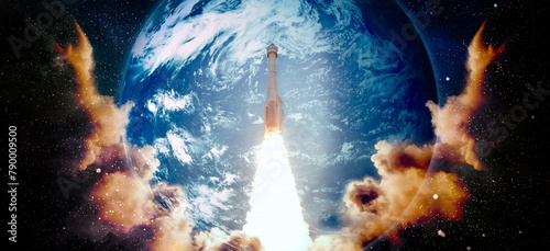 Wall mural : Rockets launch into space on the starry sky - spacecraft flies into space with clouds of smoke - eleme