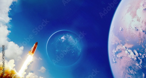 Wall mural : Rockets launch into space on the starry sky - spacecraft flies into space with clouds of smoke - eleme