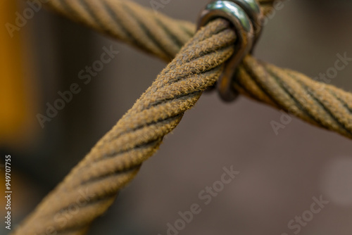 The watermark will not be included on Wall mural.: Rope crossing net nautical close up macro photography object with narrow focus old frayed material blurred background