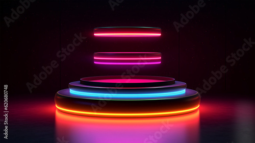 Wall mural rotating product display podium with rounded neon color light circle in black background. generative