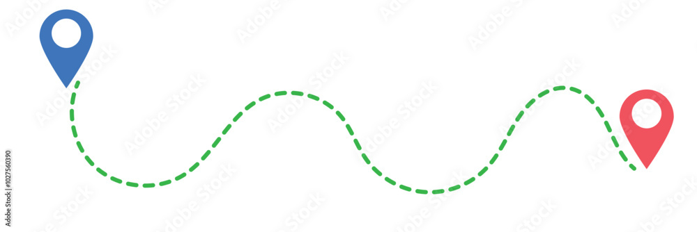 The watermark will not be included on Wall mural.: Route icon - two points with dotted path and location pin - route location icon two pin sign and dott