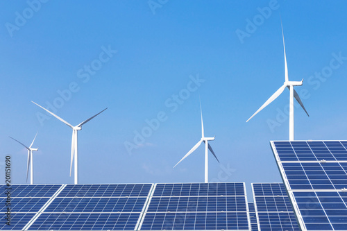 Wall mural : Rows array of polycrystalline silicon solar panels and wind turbines generating electricity in hybri
