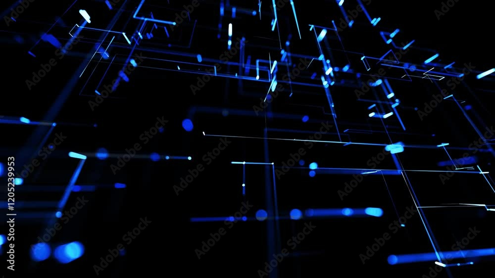 Wall mural : Running lights, glowing particles - abstract looped background as technological concept with many blu