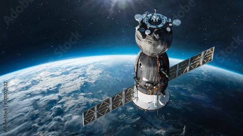 Wall mural russian spaceship on orbit of earth. sunlight and sky with clouds on background. spacecraft in outer - Wall murals Wall mural russian spaceship on orbit of earth. sunlight and sky with clouds on background. spacecraft in outer - Wall murals