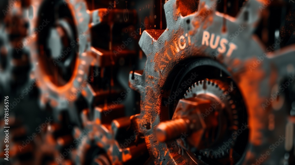 Wall mural rust programming language concept with rusty interconnected gears, small letters rust integrated in  - Wall murals Wall mural rust programming language concept with rusty interconnected gears, small letters rust integrated in - Wall murals