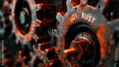 Wall mural rust programming language concept with rusty interconnected gears, small letters rust integrated in