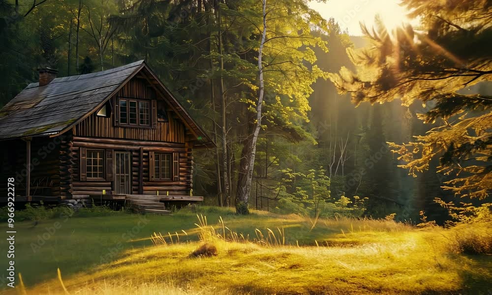 The watermark will not be included on Wall mural.: Rustic cabin in forest clearing at sunset with warm light filtering through trees