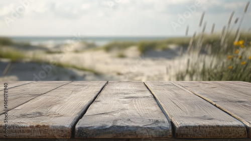 Wall mural rustic wooden table stands ready for product display, set against serene beach backdrop with soft sa - Wall murals Wall mural rustic wooden table stands ready for product display, set against serene beach backdrop with soft sa - Wall murals