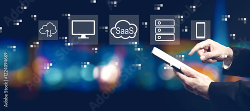 The watermark will not be included on Wall mural.: Saas - software as a service concept with businessman using a tablet computer at night