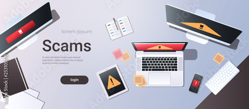 Wall mural : Scam alert internet fraud hacking scams concept top angle view desktop computer monitor laptop table