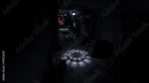 Wall mural scary empty sci fi spaceship corridor with evacuation alarm. 3d rendering. seamless loop.