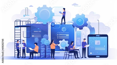Wall mural scene depicting a team of developers working on mobile app development, coding for ios or android pl - Wall murals Wall mural scene depicting a team of developers working on mobile app development, coding for ios or android pl - Wall murals