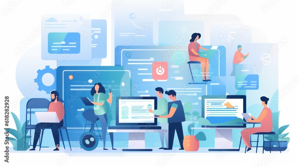 Wall mural scene depicting a team of developers working on mobile app development, coding for ios or android pl - Wall murals Wall mural scene depicting a team of developers working on mobile app development, coding for ios or android pl - Wall murals