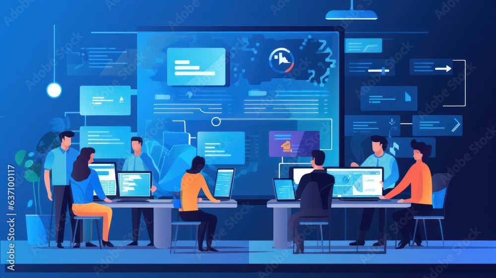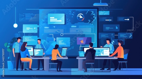 Wall mural scene depicting a team of developers working on mobile app development, coding for ios or android pl - Wall murals Wall mural scene depicting a team of developers working on mobile app development, coding for ios or android pl - Wall murals