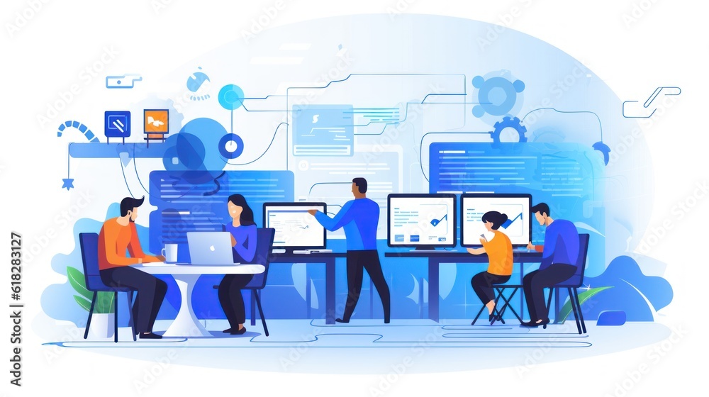 Wall mural scene depicting a team of developers working on mobile app development, coding for ios or android pl - Wall murals Wall mural scene depicting a team of developers working on mobile app development, coding for ios or android pl - Wall murals