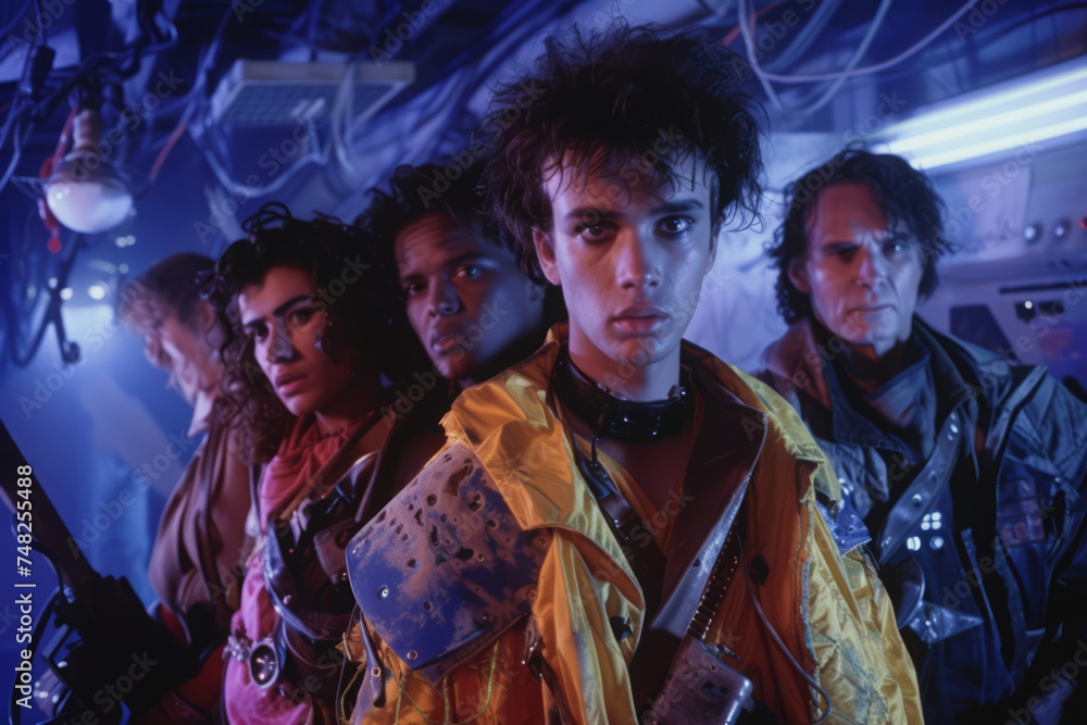 Scene from retro sci-fi series, characters in futuristic props explore the unknown aboard vintage spWall mural
