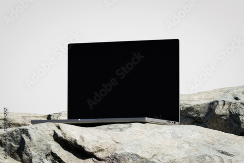The watermark will not be included on Wall mural.: Scene with a opened laptop with a blank screen on the rock
