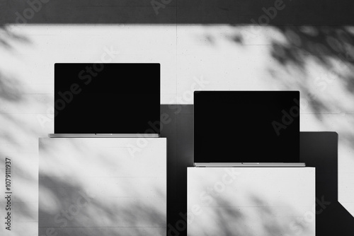 Scene with an open laptop with a blank screen on a concrete backgroundWall mural