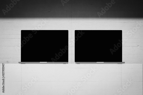 Scene with an open laptop with a blank screen on a concrete backgroundWall mural