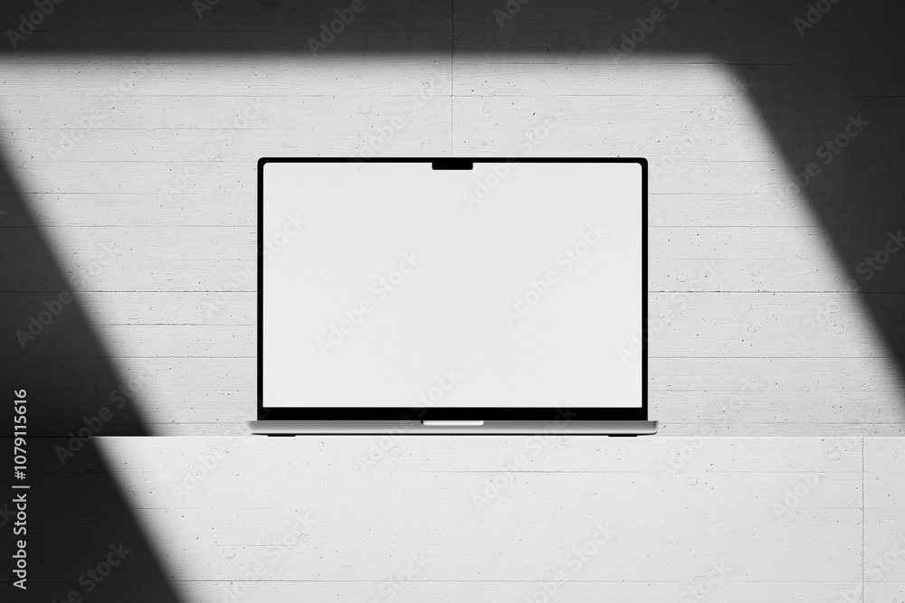 Wall mural scene with an open laptop with a blank white screen on a concrete background