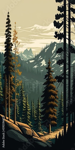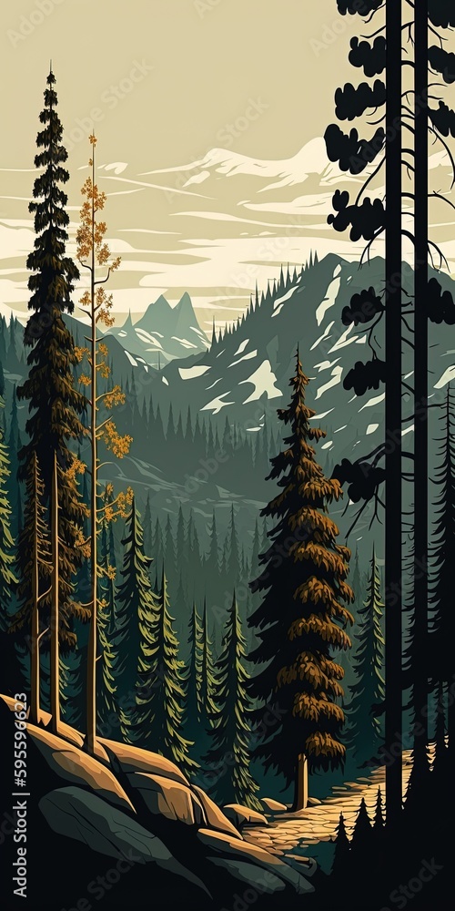 Wall mural scene with pine trees and rugged mountains. generative ai