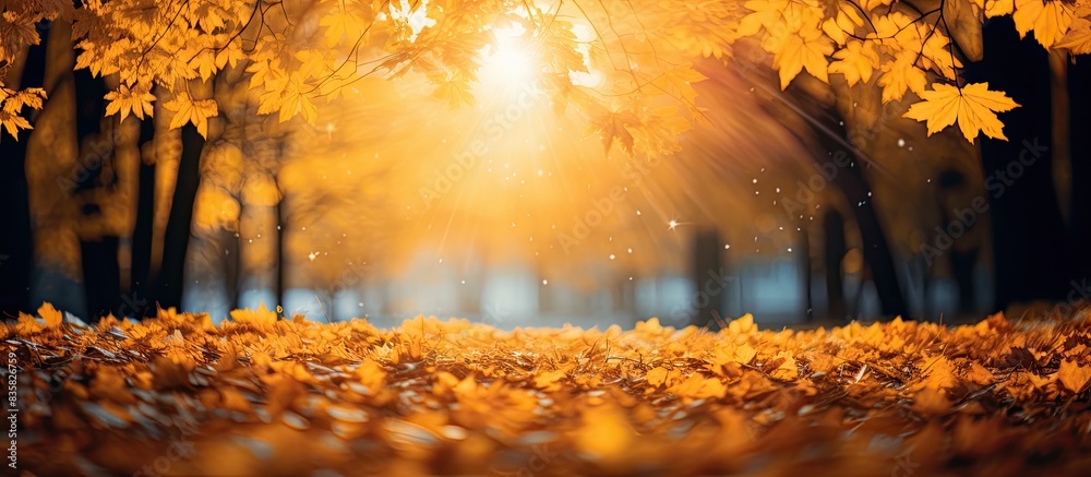 Wall mural scenic view featuring yellow trees, green grass, and sun in a park with colorful foliage. includes f