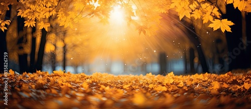 The watermark will not be included on Wall mural.: Scenic view featuring yellow trees, green grass, and sun in a park with colorful foliage - includes f